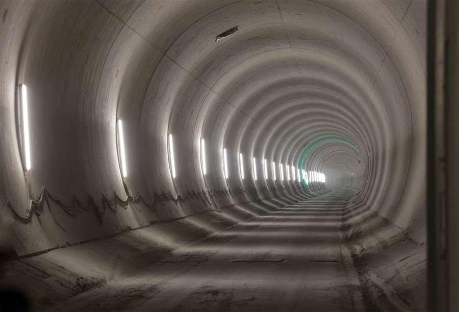 Gaismas izgaismo ceļu Brennera bāzes tuneļa būvlaukumā netālu no Insbrukas, Austrijā. 55 kilometrus garais dzelzceļa tunelis caur Austrumu Alpu pakāji zem Brennera pārejas pēc tā pabeigšanas būs viens no garākajiem dzelzceļa tuneļiem pasaulē. (Attēls: REUTERS/Leonhard Foeger)
