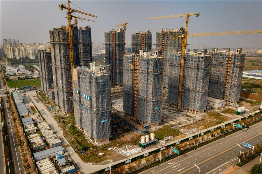 Skats no gaisa uz vairākām būvniecības stadijā esošām augstceltnēm un vairākiem celtņiem Fujangā, Ķīnā (Attēls: Sheldon Cooper/SOPA Images via Reuters Connect)