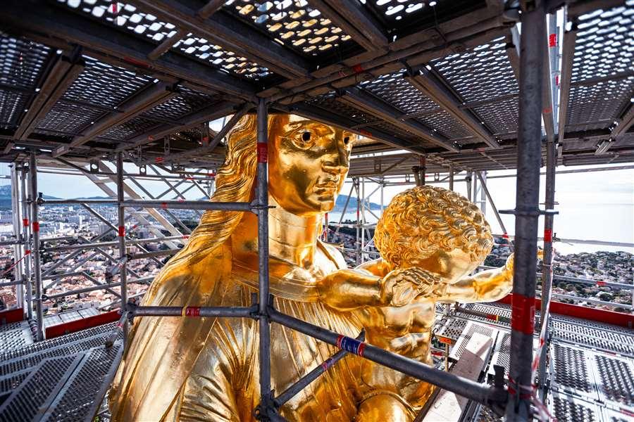 Pēc vairāku mēnešu darba ir pabeigta Notre-Dame de la Garde katoļu bazilikas renovācija Marseļā, Francijā. Vienam no pilsētas pazīstamākajiem orientieriem, Jaunavas Marijas statujai, kas atrodas bazilikas torņa augšpusē, apzeltījumam tiek piešķirti pēdējie pieskārieni, pirms tiek noņemtas sastatnes. (Foto: Džūlija Gazoti / Hanss Lūkass, izmantojot Reuters Connect)