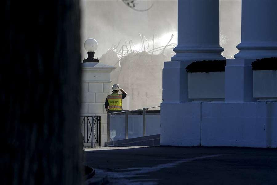 Būvstrādnieks vēro Baltā nama Austrumu spārna daļas nojaukšanu Vašingtonā, ASV. Nojauktā Austrumu spārna daļa, kas sākotnēji tika uzcelta 1902. gadā un pārveidota 1942. gadā, atbrīvos vietu prezidenta Trampa balles zāles būvniecībai. Baltā nama 27 400 kvadrātmetru balles zāles paplašinājumā paredzētas aptuveni 900 sēdvietas, un tā izmaksas tiek lēstas 250 miljonu ASV dolāru apmērā. Trampa administrācija paziņoja, ka projekta vadīšanai izvēlējusies Clark Construction, bet tā projektu izstrādājusi McCrery Architects. (Attēls: EPA/WILL OLIVER/POOL, izmantojot Reuters Connect)