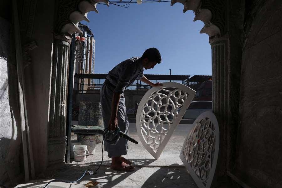 Strādnieks tīra Qamaria – tradicionālu arkveida logu darbnīcā Sanā, Jemenā, 2025. gada 11. decembrī. Šādi tradicionālie logu dizaini kļūst arvien retāk sastopami, jo tos bieži aizstāj modernas būvniecības metodes.