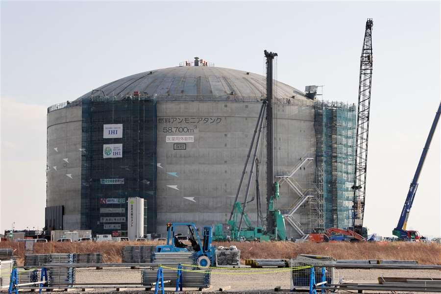 Būvniecības stadijā esoša amonjaka degvielas uzglabāšanas tvertne enerģijas ražošanas uzņēmuma JERA Hekinanas termoelektrostacijā Aiči prefektūrā, Japānā. 2024. gadā JERA paziņoja, ka sadarbojas ar IHI pie pasaulē pirmā liela apjoma degvielas amonjaka aizstāšanas demonstrācijas testa (20% no siltumvērtības) liela mēroga komerciālā ogļu termoelektrostacijā, pirms liela apjoma degvielas amonjaka aizstāšanas komerciālās ekspluatācijas uzsākšanas.